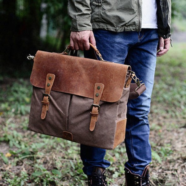 Men Vintage Canvas Messenger Bag Crossbody Bag Retro Genuine Leather Handbag